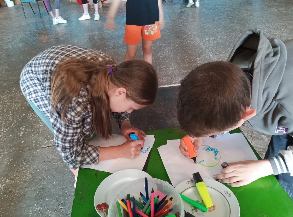 Затем заведующая библиотекой\ провела для школьников увлекательные эстафеты, игры. Дети из лагеря соревновались в актерском мастерстве в конкурсе пантомимы "Какая я птица?" Затем рисовали нашу прекрасную планету, готовили шашлычки из груши, переправлялись через воображаемое болото.