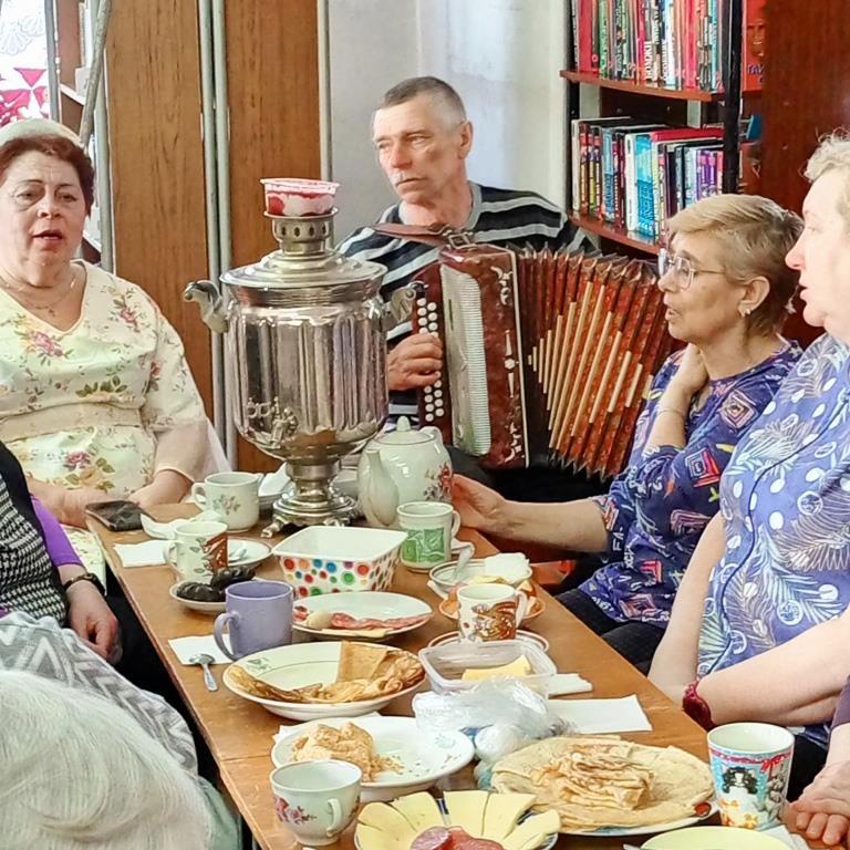 Участники клуба собрались за праздничным столом, каждый принес с любовью испеченные блины по своему особому рецепту. Веселые шутки, викторины, песни сопровождали застолье. Добавили озорства и смеха участие в конкурсах, а также в традиционных играх «Ручеек», «Хоровод». Завершилось мероприятие просьбами прощения друг у друга, пожеланиями благополучия. Выставка-инсталляция «Счастливой Масленицы» дополнила дружескую встречу.