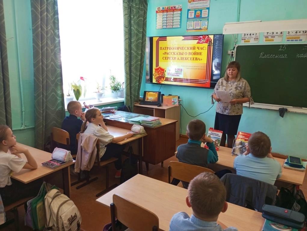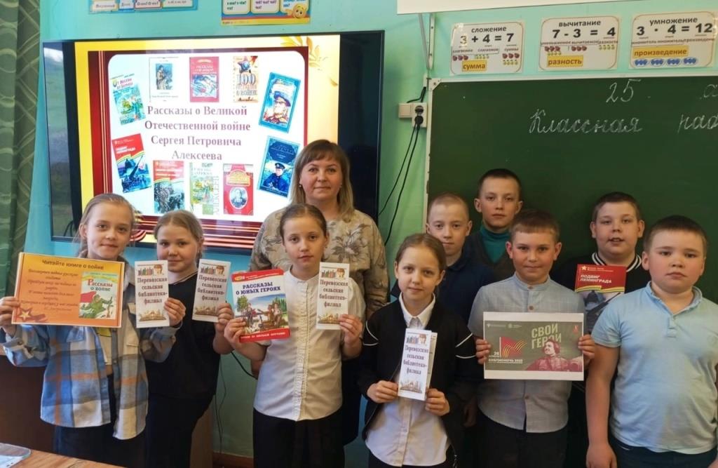Перевозская сельская библиотека-филиал присоединилась к данной акции. В 3 классе МКОУ ООШ д. Перевоз прошел патриотический час по военным рассказам С.П. Алексеева. В начале мероприятия юные читатели познакомились с биографией известного детского писателя, автора многочисленных произведений о русской истории, участнике Великой Отечественной войны.
