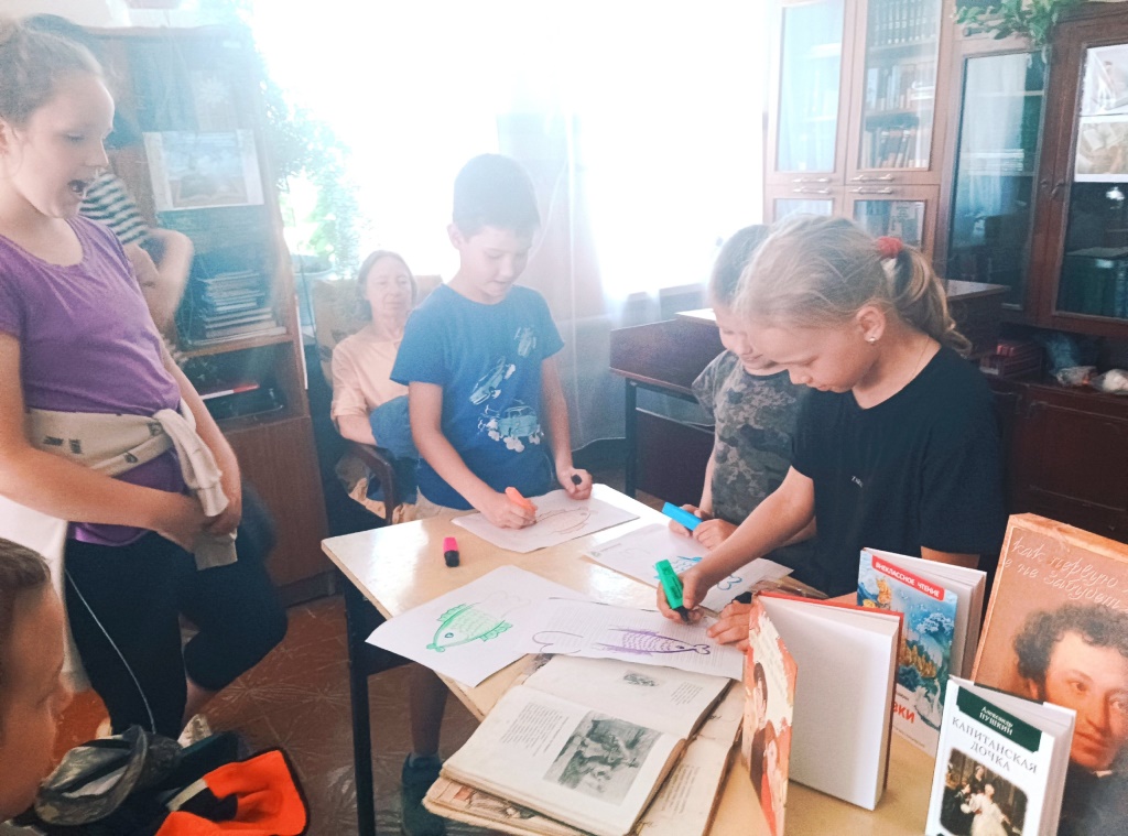 Зыковская сельская библиотека пригласила детей школьного лагеря в клуб весёлых и начитанных принять участие в мероприятии "Давайте Пушкина читать". Заведующая библиотекой провела со школьниками разминку. Она задавала вопросы по сказкам поэта. Это задание выполнили блестяще. Затем играли в игру "Золотая рыбка". На карточках с рыбками, завязав глаза, рисовали недостающие рыбкам хвосты.