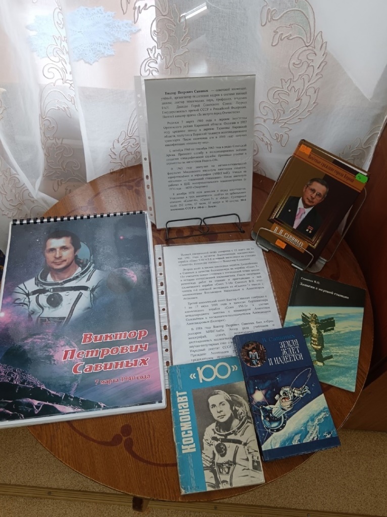 К юбилею В.П. Савиных в читальном зале Нолинской районной библиотеки оформлена выставка «Дорога в космос начинается с Земли». Здесь, помимо литературы об освоении космоса, представлены книги нашего прославленного земляка-космонавта «Земля ждет и надеется», «Записки с мертвой станции». Приглашаем читателей познакомиться с этими изданиями.