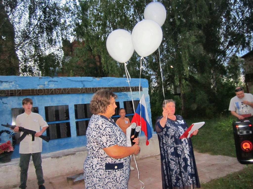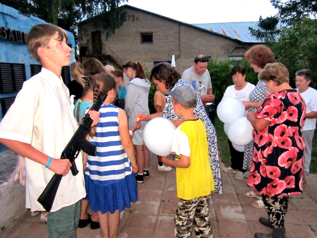 Заведующая библиотекой Малых Т. А. и заведующая Домом культуры Медведева Н. Л. в память о погибших детях прочли стихотворения. Дети вокального кружка и их руководитель Ероховец О. В. исполнили песню «Аист на крыше». Пришедшие жители села почтили память детей минутой молчания. В небо из наших рук легко, стремительно и безвозвратно улетали белые шары, как души погибших детей, пришедших в этот мир для радости и счастья, узнавших много боли, потерь и горя.