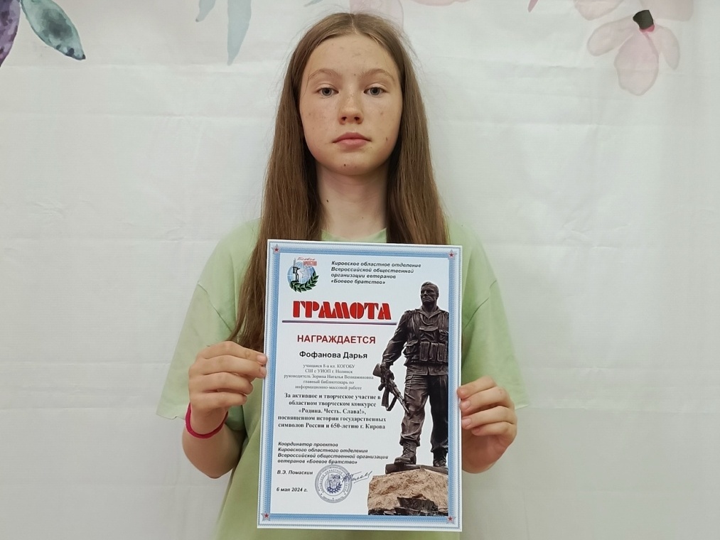 Фофанова Дарья, учащаяся 8"а"класса школы г. Нолинска награждена Грамотой за активное и творческое участие!