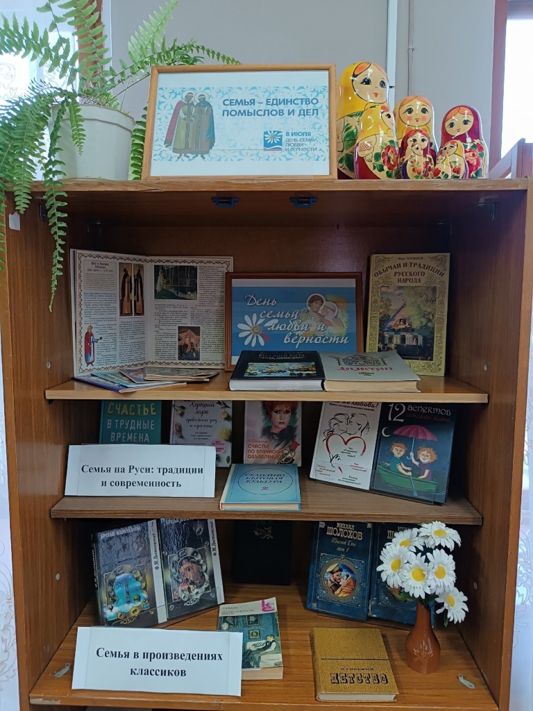 В читальном зале районной библиотеки оформлена выставка «Семья – единство помыслов и дел». Здесь читатели могут познакомиться с семейными традициями наших предков, прочитать советы современных семейных психологов и, конечно, перелистать страницы классиков, обращенные к семье.