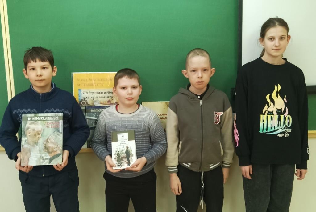 Заведующая библиотекой провела обзор книг "Война на страницах книг". Затем познакомила детей с книгой Виктора Бакина "Детдомовских сороковые". Она рассказала школьникам о блокаде Ленинграда и спасении детей.