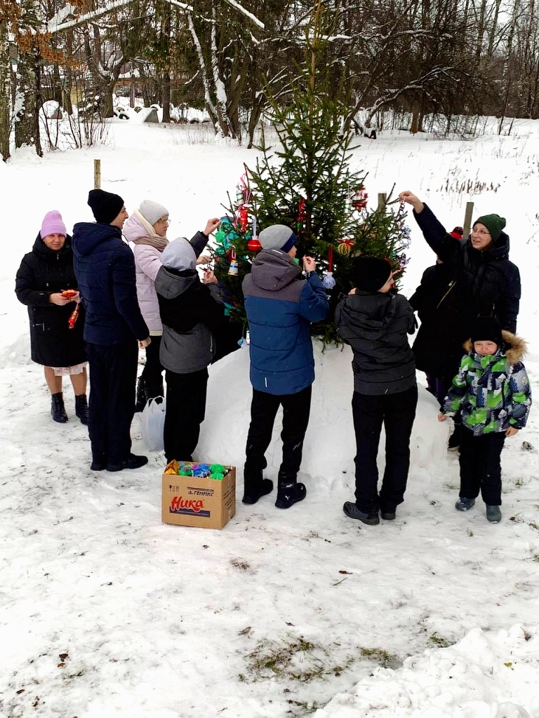 Вот и готова наша новогодняя игрушка, очень красивая и оригинальная, а главное неповторимая. Ведь другой такой в магазине не купить. Присутствующие смастерили множество красивых, прекрасных, удивительных игрушек, а затем все дружно наряжали нашу елочку на улице и водили хоровод!