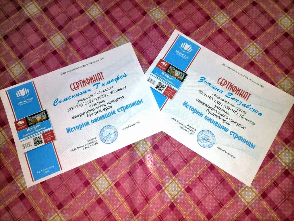 Семенихин Тимофей, учащийся 7 «д» класса, и Зыкина Елизавета, учащаяся 9 «в» класса школы г. Нолинска, приняли участие в этом конкурсе. Дети награждены сертификатами участников. Поздравляем!