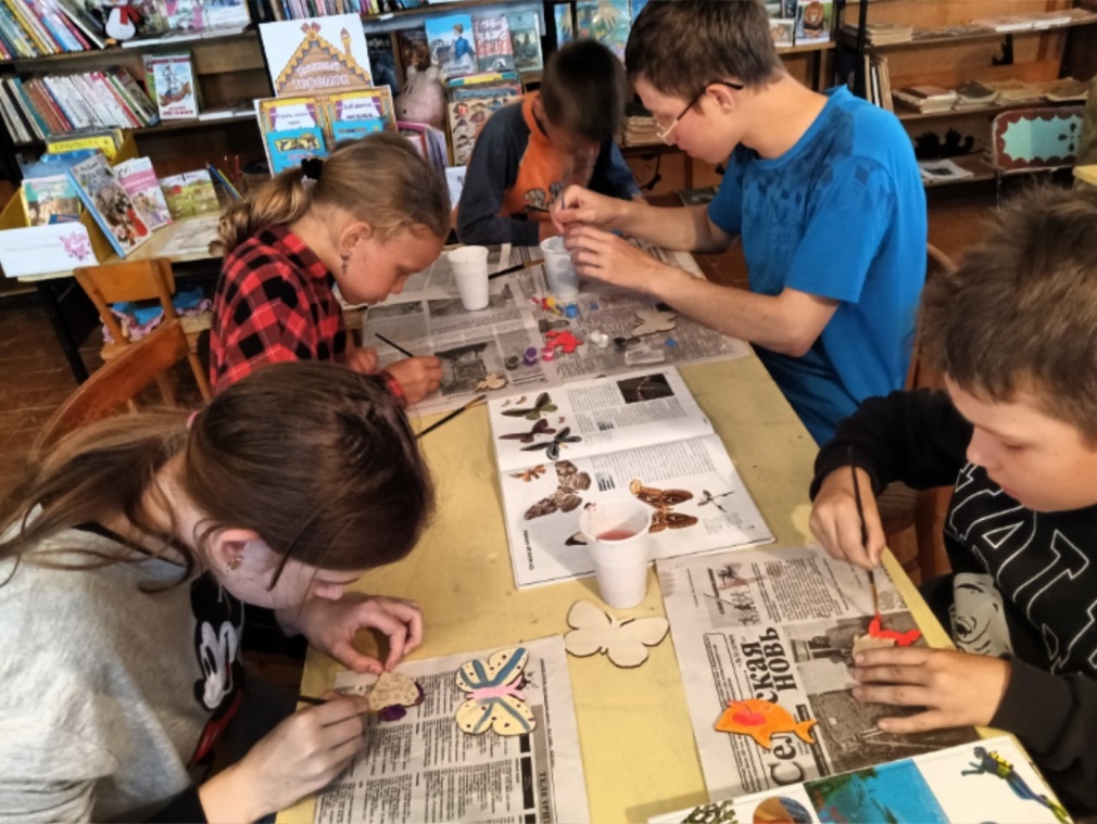 Зыковская библиотека провела с клубом "Книжкины друзья" мастер-класс по раскрашиванию деревянных бабочек и морских обитателей акриловыми красками "Крылатые цветы", "Подводные жители".