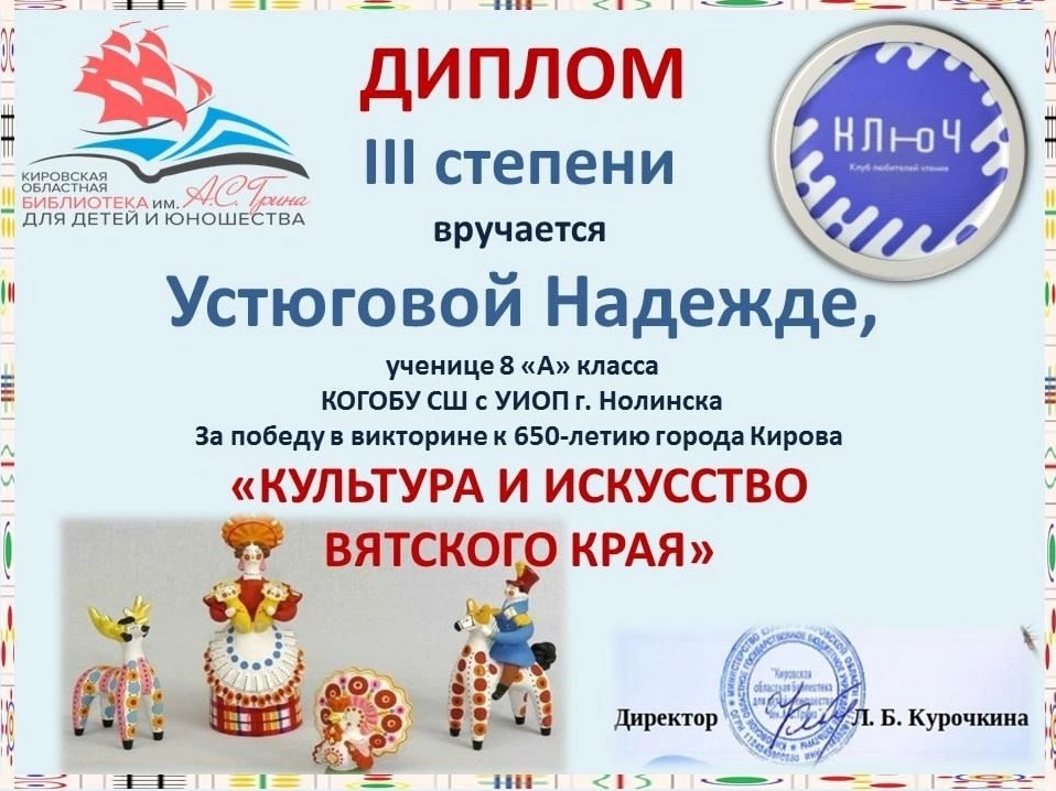 Читатели Нолинской детской библиотеки принимали активное участие в викторине к 650-летию города Кирова "Культура и искусство Вятского края".