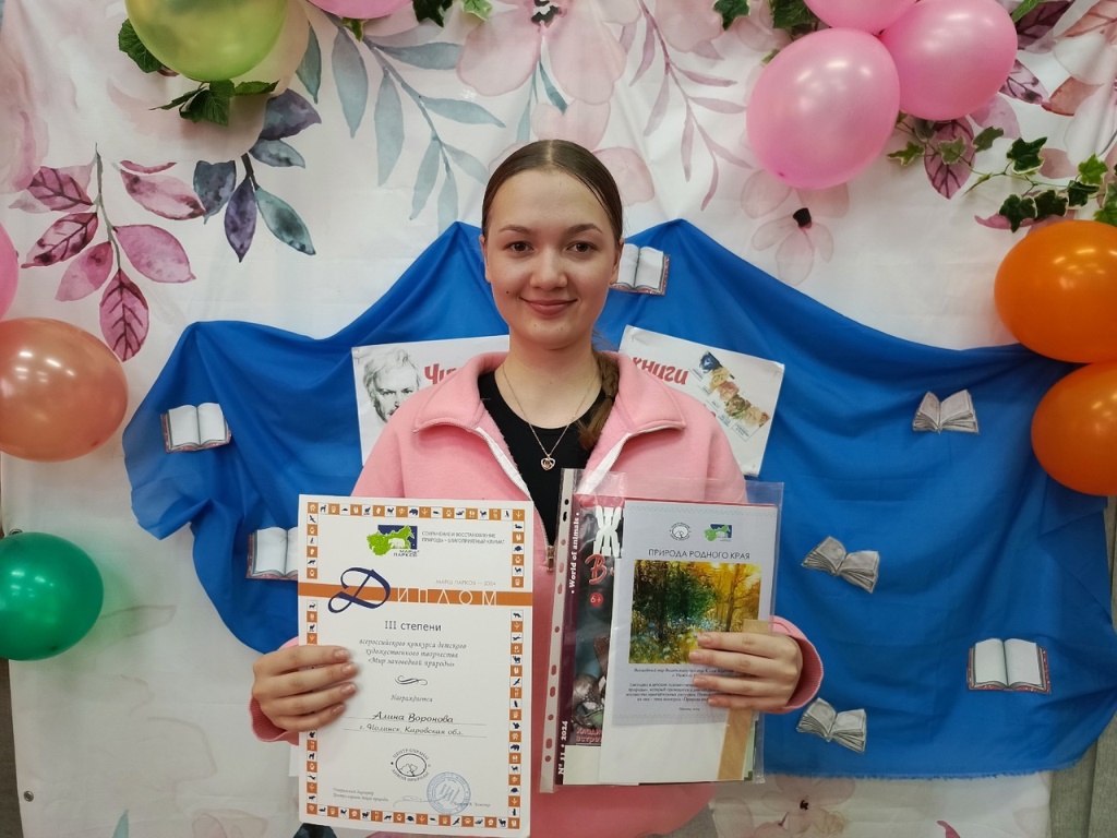 Воронова Алина, учащаяся 9 "б" класса школы г. Нолинска, приняла участие во Всероссийском конкурсе детского художественного творчества "Мир заповедной природы"- Марш парков- 2024.