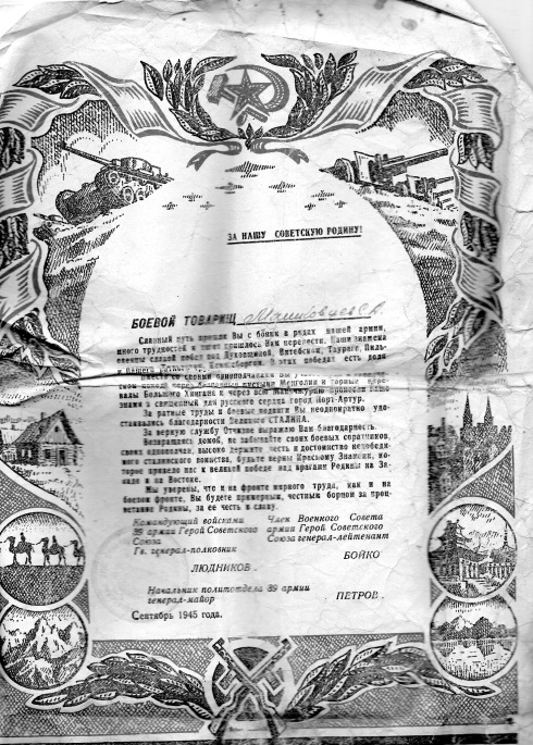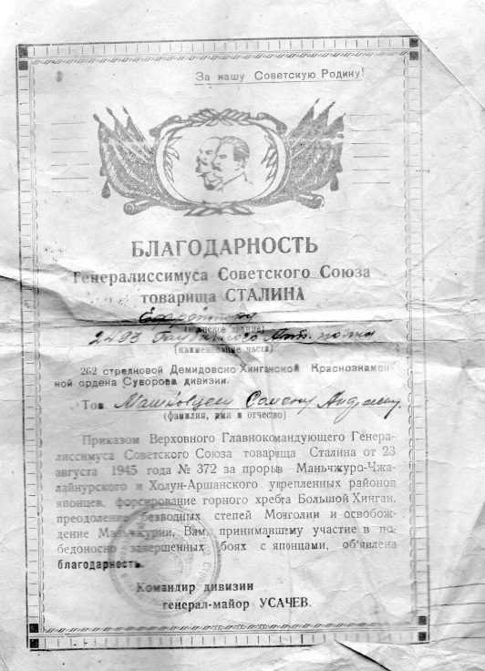 - от 23 августа 1945 г №372 «За прорыв Маньчжуро-Чжалайнурского и Холун- Аршанского укрепленных районов японцев, форсирование горного хребта Большой Хинган, преодоление безводных степей Монголии и освобождение Манчжурии.»