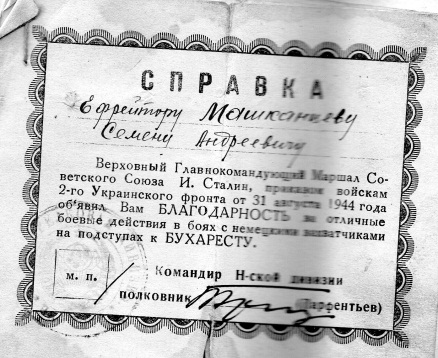 - от 31 августа 1944 г. «За отличные боевые действия в боях с немецкими захватчиками на подступах к Бухаресту»