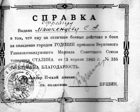 - от 13 апреля 1945 г. №335 «За отличные боевые действия в боях за овладение городом Годонин»