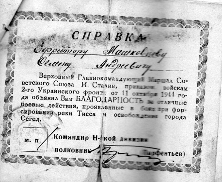 - от 11 октября 1944 г. «За отличные боевые действия, проявленные в боях при форсировании реки Тисса и освобождении г. Сегед.»