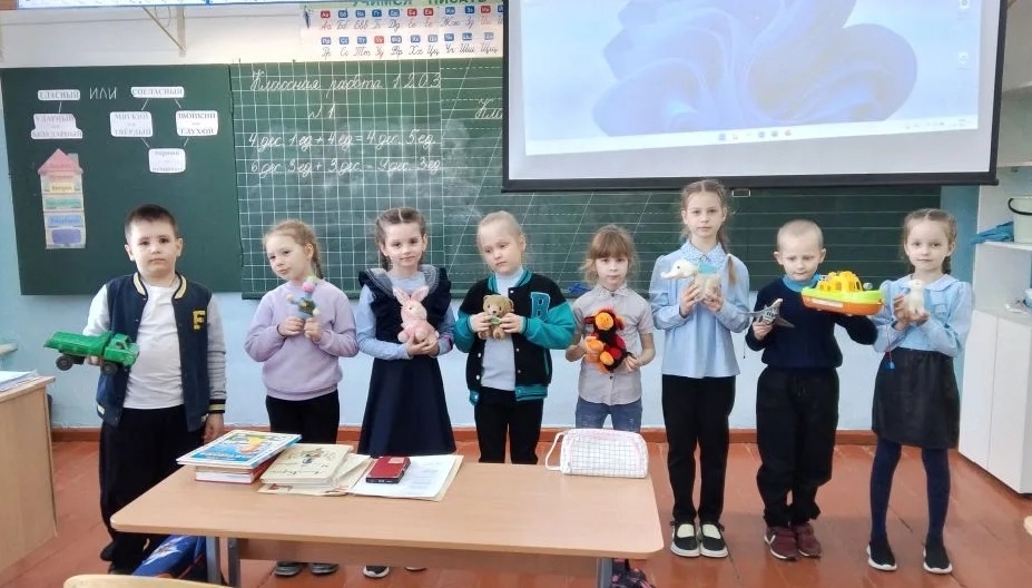 Первоклассники вспомнили стихотворения про игрушки, прочитав их наизусть, представили свои иллюстрации к книгам, с удовольствием посмотрели музыкальный мультфильм "Девочка-рёвушка".