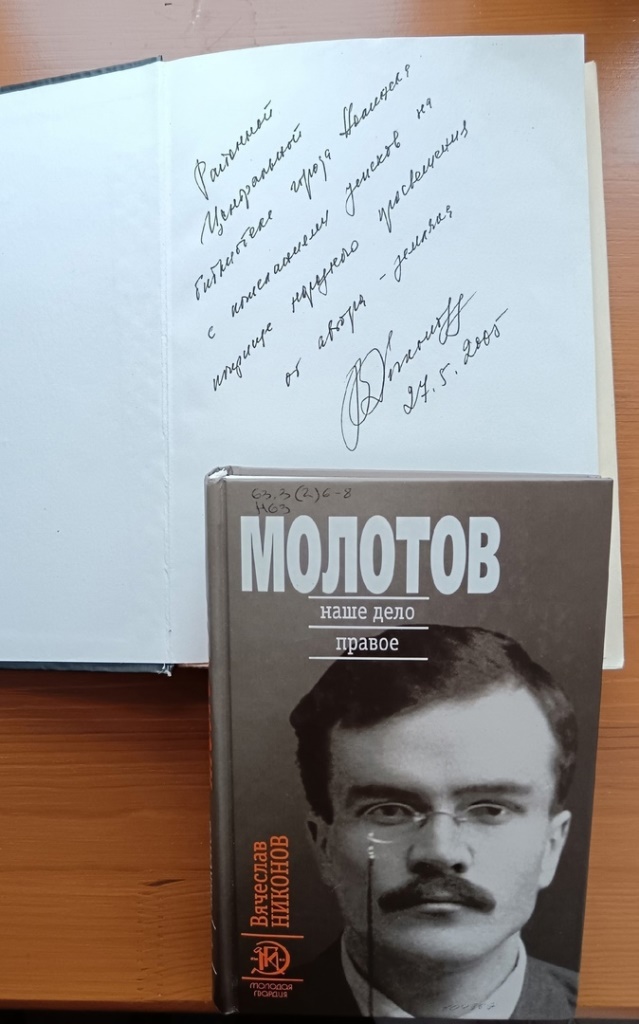 Познакомились с книгами Никонова В.А. «Молотов. Молодость» и «Молотов. Наше дело правое» (в двух книгах). Книга «Молотов. Молодость» снабжена авторской надписью Вячеслава Никонова.