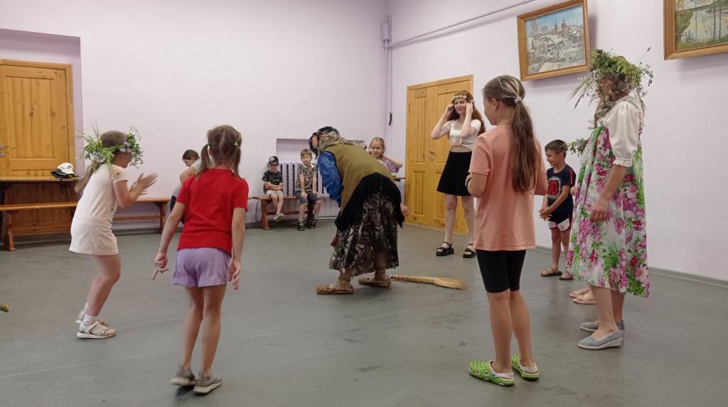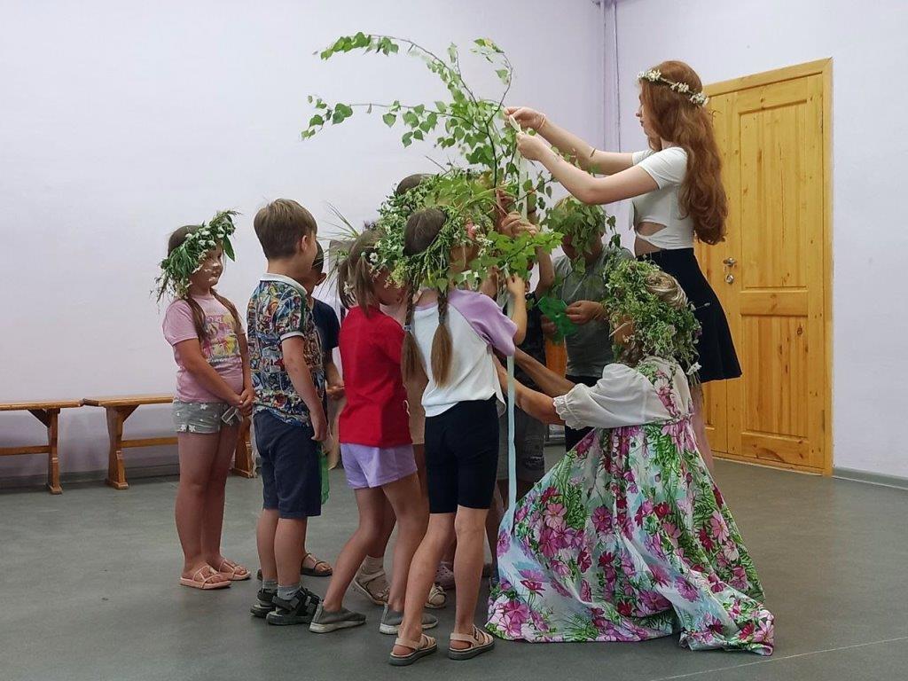 В гости к ребятам заглянула Алёнушка, подарив маленьким гостям венки из полевых цветов. Она познакомила детей с традициями и обычаями праздника. Завязали ленточки на березку, загадав при этом своё желание. Но не обошлось на празднике и без нечисти. Откуда ни возьмись, появилась Баба Яга, которая пугала детей и пыталась испортить им праздник. Но у детей были надеты обереги «венки», которые смогли защитить от нечистой силы. Аленушка провела с ребятами игры и конкурсы, такие как: «Ступа Баба Яги", "Метелочка», «Морская фигура замри» и т.д. Затем вместе с героями праздника ребята по традиции отправились на поиски папоротника, где был спрятан клад «сладкие призы».