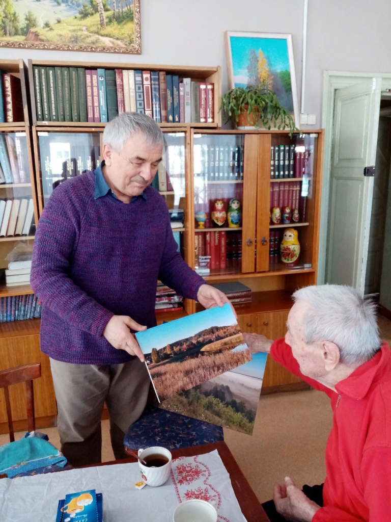 Неожиданным и приятным было появление на встрече нашего земляка, поэта, художника Мохова Сергея Геннадьевича. В исполнении автора прозвучала комическая поэма «Рога». Сергей Геннадьевич в преддверии юбилея подарил В. С. Путинцеву две свои великолепные работы, фотопейзажи, выполненные в технике печати на пенокартоне.