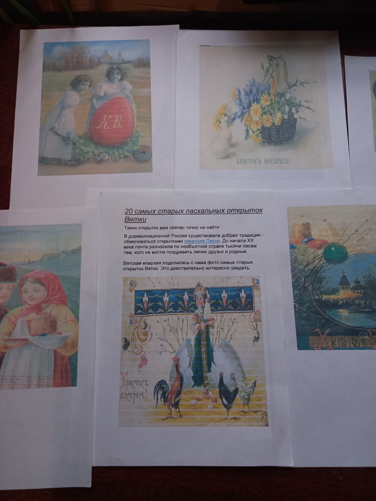 Поговорили о пасхальных приметах и обычаях, поиграли в игру "Что кладут в кулич?". На выставке "Нить времени" были представлены 20 самых старых пасхальных открыток Вятки. Дети узнали,что в дореволюционной России существовала добрая традиция - обмениваться открытками накануне Пасхи.