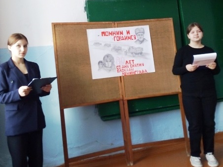 С помощью электронной презентации школьники познакомились с жизнью города-героя, проведен обзор литературы, отражающей события того времени, особое внимание уделено произведению А. Адамовича и Д. Гранина "Блокадная книга", представлены фрагменты рассказов очевидцев, переживших блокадные дни.