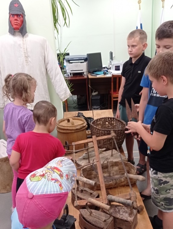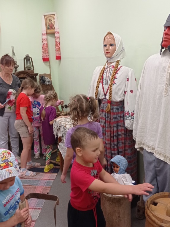 На экскурсии в «Уголок старины» ведущая познакомила ребят с его экспонатами, с их историей. Интерес вызвали предметы домашнего быта, которые использовали наши предки. Дети с удивлением рассматривали их.