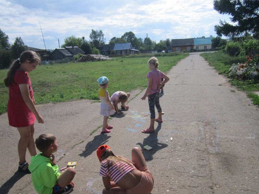 На последней в нашем путешествии планете «Художественная» дети рисовали на асфальте портреты сказочных героев. Площадку перед библиотекой украсили портреты Мальвины, Буратино, Бабы Яги.